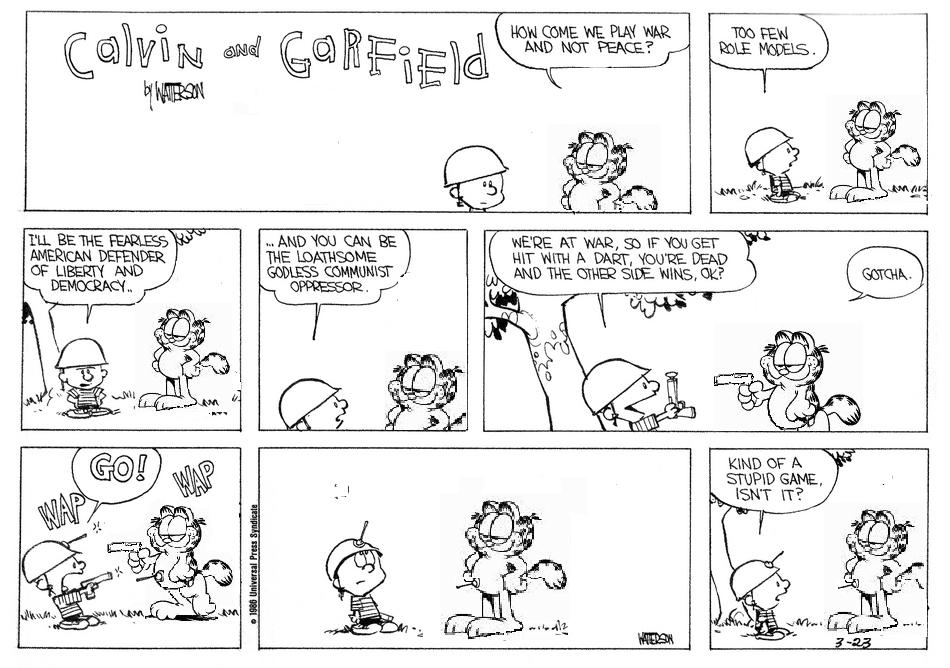 There’s a cool website out there called Garfield Minus Garfield, which takes Garfield out of his eponymous uncool strip. The orginal is by Jim Davis; the reinvention is by Dan Walsh. Sample: