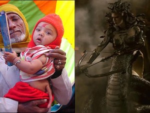 Wiig’s character finally agrees, and Swift hands the baby over. But the catch is that the infant has a tail (like that one baby in India), but it’s more like a boa.