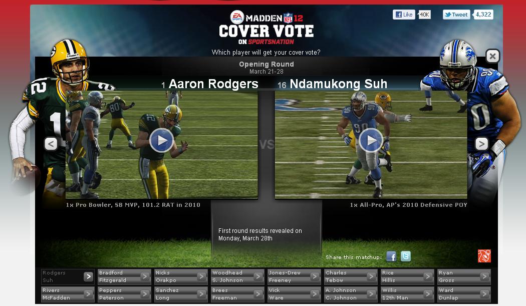 Where you play a part, faithful readers, is in the online vote. A bracket hosted by ESPN can be accessed by clicking here. Vote for Green Bay’s Super Bowl-winning quarterback, Aaron Rodgers… not our defensive Wunderkind, Suh. Don’t make him come to your house…