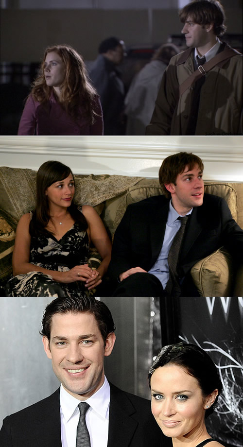 In The Office, John Krasinski’s character dated both Amy Adams and Rashida Jones’ characters, and in real life he’s married to Emily Blunt (she played Miss Piggy’s receptionist in Paris).