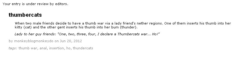As I mentioned in my last post, over some drunken conversation, the subject of dirty slang terms and phrases came up arose happened. And mind you – women were present and one provided this first term that was not on Urban Dictionary. I was happy to submit it, but I’m still awaiting their final approval. You can check for it maybe one day soon, but allow me to present: