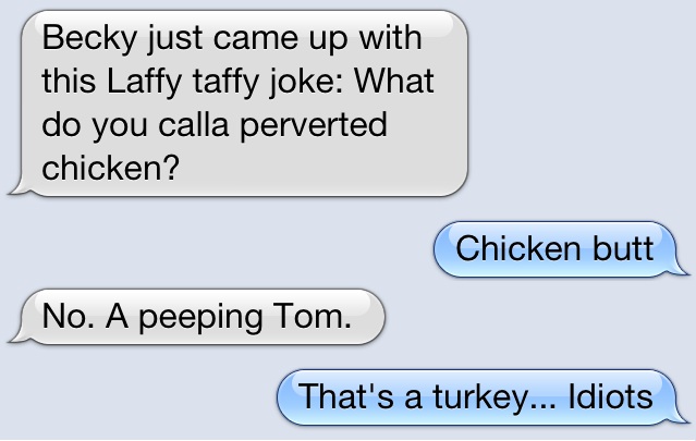 turkey joke Posted on December 7, 2012 by sgottahurt Post a comment or leave a trackback: Trackback URL. Not a very polite beginning, but a beginning nonetheless.