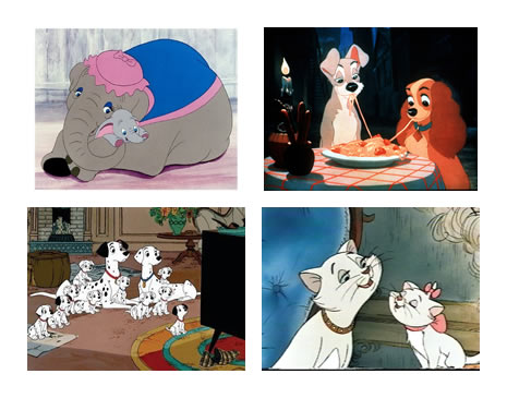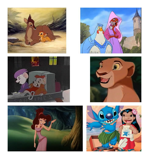 These are the unlucky ones that break the blue streak. It makes sense that Bambi’s Mother and Nala don’t represent the traditional hue, seeing as how their stories take place in the wild, but it’s also interesting that the anthropomorphized animals (Maid Marian and Bianca) wear purple alongside the temptress-turned-heroine Megara. I figure Lilo never wears blue since her pet “puppy” Stitch is nothing but.