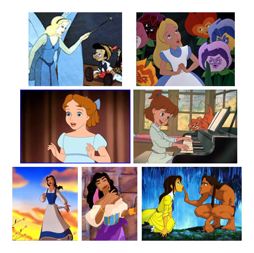 This one’s easy. The Blue Fairy has the color in her name; Alice & Belle and Wendy & Jenny are practically twins; Esmerelda’s corset is blue and for Jane it’s her kerchief. Blue eyes are shared by almost all of these ladies as well. Sorry Belle (brown) and Esmerelda (green).