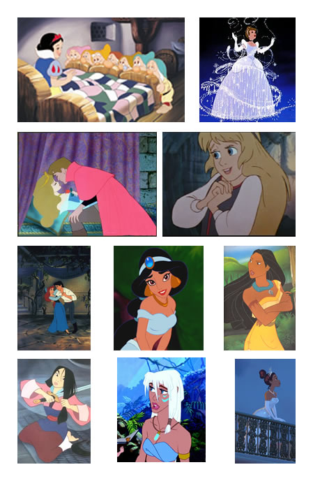 Snow White - Cinderella - Aurora (Briar-Rose) - Eilonwy - Ariel - Jasmine - Pocahontas - Mulan - Kira - Tiana