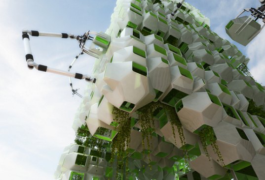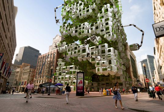 …a vertical tower of prefabricated “eco pods” filled with bio-fuel producing algae for the space. The new tower would act as a center to test new algae species and different growing methods. (via Inhabitat)