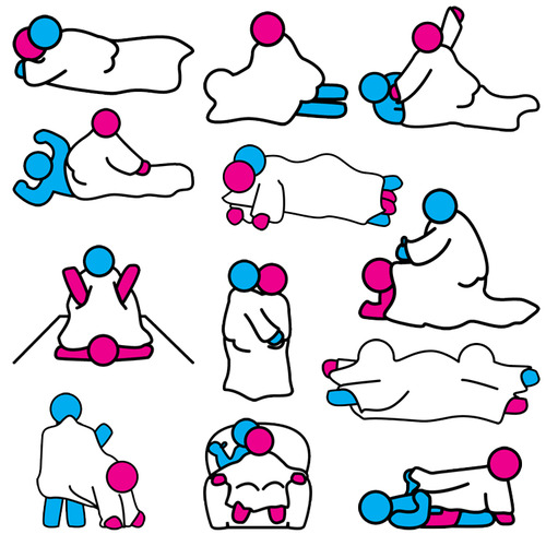 Based on the Kama Sutra, the ancient Indian sex guide (like how The Joy of Sex bent over spoofed The Joy of Cooking… and the Kama Sutra), the Snuggie Sutra offers up suggestions for couples, depending upon whether you’re blue or pink, or your Snuggie is blue or pink (or green or zebra), it looks… hot.